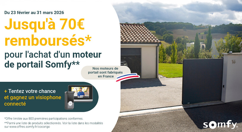 Jusqu'à 70 € remboursés pour l’achat d’un moteur de portail de la marque Somfy. + Tentez de gagner grâce au tirage au sort un des 5 visiophones connectés V500 Connect d’une valeur de 499 € TTC. *Voir les modalités sur https://offres.somfy.fr/
