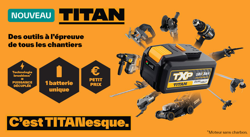 Titan propose une gamme de produits performants avec une batterie unique, pour vous accompagner dans tous vos travaux. Découvrez des outils conçus pour travailler ensemble, en toute confiance, sans jamais vous lâcher.