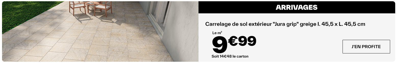 Découvrez la gamme de carrelage extérieur abordable Brico Dépôt, parfait pour transformer votre espace extérieur sans casser votre budget. Sélectionnés pour leur durabilité, leur qualité et leur résistance aux intempéries, les modèles de carrelages extérieurs qui vous sont proposés sont parfaits créer une terrasse, un balcon, une cour attrayante et fonctionnelle ou encore une plage de piscine. Facile à installer et à entretenir, notre carrelage pas cher est idéal pour les projets de rénovation ou de construction neuve.