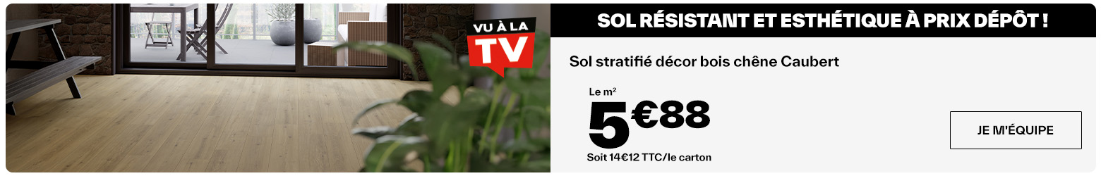 Retrouvez tous nos modèles de parquets stratifiés à l’excellent rapport-qualité prix sur le site internet bricodepot.fr ou en dépôt près de chez vous. S’adaptant à tous les styles déco, ils offrent un décor soigné et sont résistants aux chocs et à l’usure. Ces revêtements de sols vous accompagneront dans le temps et sont parfait pour les pièces de vie et de passage, conservant leur charme année après année, sans nécessiter d’entretien spécifique.